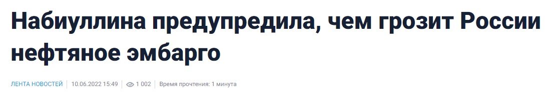 Выступая на традиционной пресс-конференции 10 июня, глава ЦБ Эльвира Набиуллина отдельно остановилась на том, какие риски создает для российской экономики нефтяное эмабрго.