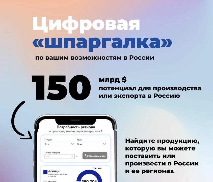 Подборка новостей по импортозамещению за неделю 6 - 12 июня 🔵 Новый сервис по импортозамещению: «ЦИФРОВАЯ ШПАРГАЛКА» для ваших возможностей в России. Это единая база находящейся под санкциями продукции, которую вы можете поставить или произвести в России и ее регионах. Потенциал для производства или экспорта в РФ составляет 150 млрд $! 🔵 Импортозамещение как выгодная инвестиция: переход на российские системы BI 🔵 Минцифры РФ должно подготовить предложения по созданию индустриальных центров компетенций для импортозамещения 🔵 Власти России к 1 августа подготовят дополнительные меры поддержки для внедрения российских IT-технологий 🔵 Кабмин РФ скорректирует механизм поддержки региональных программ развития промышленности 🔵 Кабмин РФ выделит более 900 млн рублей на применение цифровых технологий в сельском хозяйстве 🔵 Минпромторгом России сформирован Ситуационный центр по вопросам внешнеторговой деятельности 🔵 Правительство продолжает расширять список технологического обор