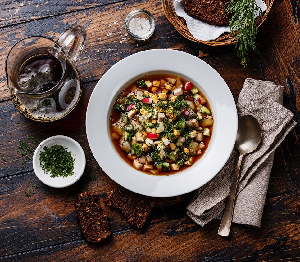 Порций 6 Время приготовления 30мин Калорийность 395 ИНГРЕДИЕНТЫ ИНСТРУКЦИЯ ПРИГОТОВЛЕНИЯ 1. Как сделать классическую окрошку с колбасой? Подготовьте продукты для приготовления окрошки. Картофель надо предварительно отварить. Для этого хорошенько помойте его и неочищенным закиньте в кипящую воду, так в нем сохранятся витамины. Варите картофель 25 минут. Яйца отварите в течении 10 минут после закипания. Затем оставьте их остывать в той воде, в которой они варились. Так белок останется мягким, а желток ярким. 2. Зеленый лук хорошо промойте под проточной водой, затем обсушите при помощи бумажных или обычных полотенец. Порежьте лук 3. Сложите лук в емкость, в которой будете готовить окрошку. Добавьте соль. С помощью пестика или любой другой толкушки разомните лук до выделения сока. Окрошка с добавлением такого мятого лука приобретает яркий вкус и аромат 4. Укроп промойте под холодной водой, обсушите. Отделите жесткие стебли, их лучше не использовать. Остальные веточки мелко порубите 5. От