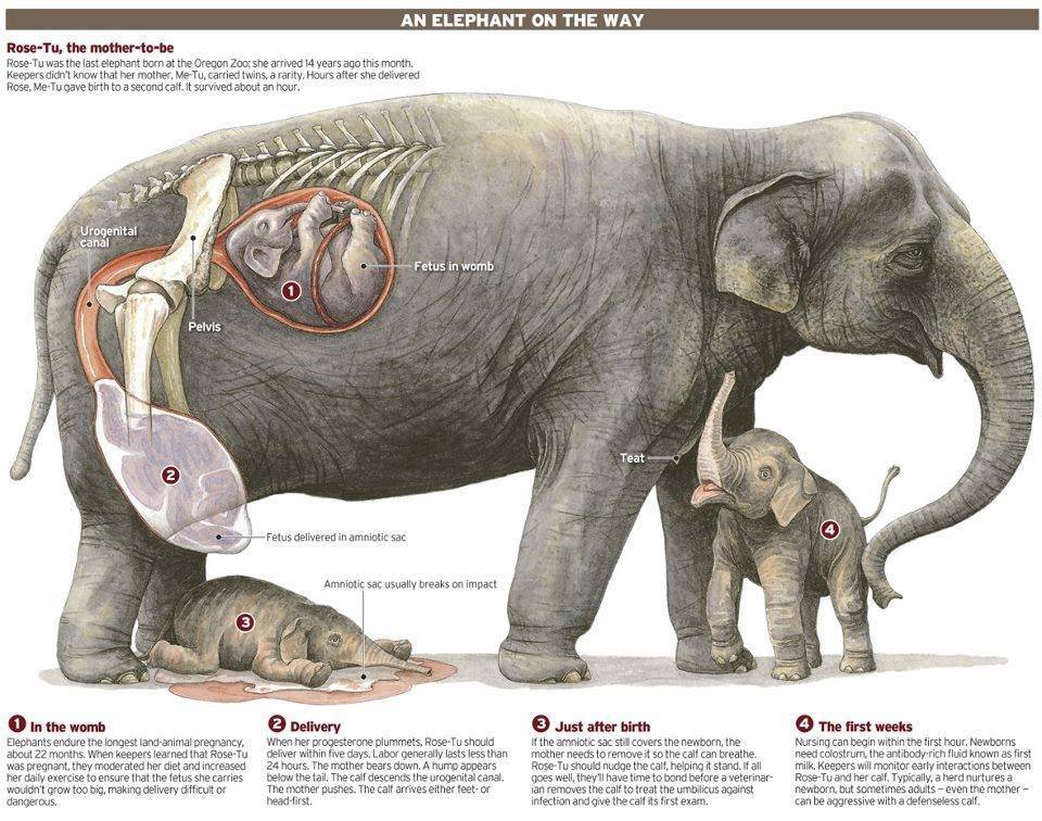 Вы знали, что слониха может задержать момент родов на целые сутки? Ведь рожать они предпочитают под покровом ночи. Просто фантастика! Кроме того, плод они вынашивают целых 22 месяца. Только представьте, если бы человеческая беременность длилась столь долго! Думаю, это было бы ужасно, для слонов же – сущий пустяк. Кстати, вес новорожденного слона составляет больше 100 кг (~113 кг). Вот это крепыши! Что ещё удивительно, родовые пути слоних, как и у питонов, тянутся вслед за околоплодным мешком, пока он не лопнет, разбрызгивая воды и кровь.