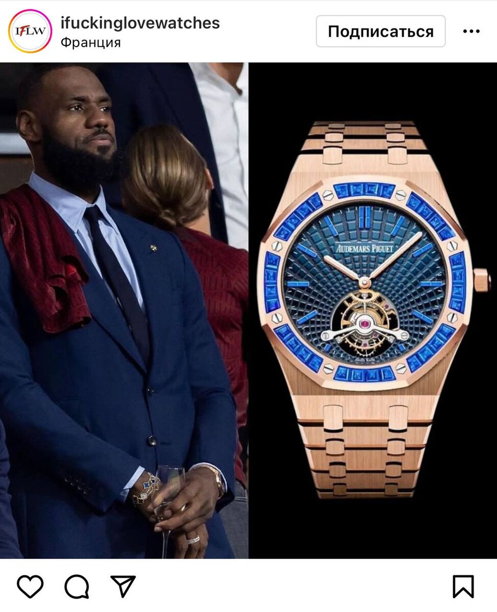 Какой красивый кастомный Audemars Piguet Royal Oak у Леброна. Очень красивые синие сапфиры огранки багет. Безель украшен 32 камнями. И обратите внимание, что временные отметки тоже сделаны из элегантных тонких сапфиров, которые идеально сочетаются с циферблатом с узором Tapisserie Évolutive. Стоимость такой кастомной модели около 500 000 долларов.
