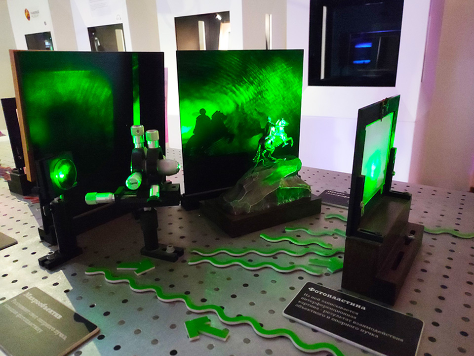 Чтобы был понятен процесс записи монохромных голограмм, вниманию гостей сразу представлены схемы. На примере уменьшенной копии памятника Петру I и матрешки можно отследить все этапы создания изображения.