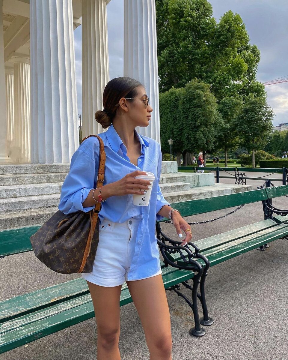 С приходом тепла одежда становится легче и короче, поэтому женщины могут смело пополнять летний гардероб модными шортами. К счастью, выбрать есть из чего – спортивные, трапециевидные, цветные, на резинке, из денима и плотного трикотажа. Мы подобрали для вас 12 стильных и актуальных ансамблей с шортами на лето. Джинсовые шорты – нестареющая классика. Высокая посадка является обязательным условием, а вот цветовое решение может быть самым разным, чаще всего это белый, привычный синий или голубой цвет. Не хуже шорты из денима будут смотреться с принтованной рубашкой. Завяжите ее концы небрежным узлом, этот модный прием выгодно подчеркнет талию, добавит силуэту утонченности, а образу интриги. Жакет кремового оттенка прекрасно сочетается как с джинсовыми, так и с трикотажными шортами. Короткие шорты выглядят довольно провокационно в офисном стиле, но это удачный вариант для повседневного образа. В таком виде можно посидеть с подругами в кафе или пойти на свидание с любимым. Шорты-трапеция ид