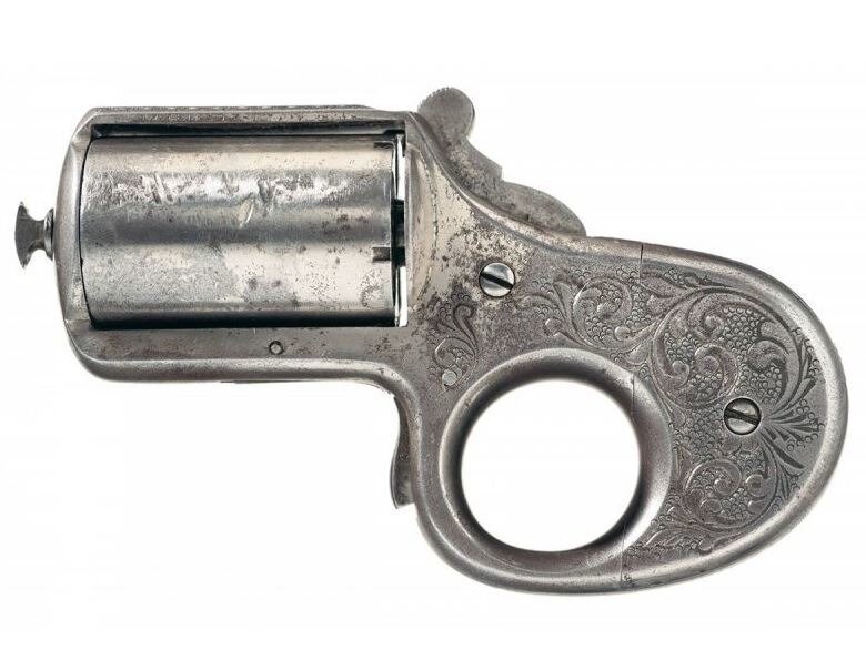 "Мой друг". Револьвер-кастет "Мой друг" был разработан в 1865 году американцем ирландского происхождения Джеймсом Ридом. В годы гражданской войны возник большой спрос на оружие самообороны, которое можно было спрятать в одежде и постоянно иметь под рукой. И револьвер-кастет Рида, сочетавший в себе возможности обоих этих видов оружия подходил для целей самообороны как нельзя лучше. По конструкции, это был типичный пеппербокс, у которого каморы барабана одновременно служили и стволами. Рамка с массивной рукояткой изготавливались из стали или латуни. В рукояти было проделано круглое отверстие, предназначенное для более надежного удержания оружия при использовании его как в качестве револьвера, так и кассета. Револьвер "Мой друг" выпускался в трех калибрах. Модель 22-го калибра имела барабан на 7 патронов кольцевого воспламенения. На моделях 32-го и 41-го калибров использовался барабан на 5 патронов. Причем револьверов 41-го калибра было выпущено меньше всего, поэтому в наше время такие эк