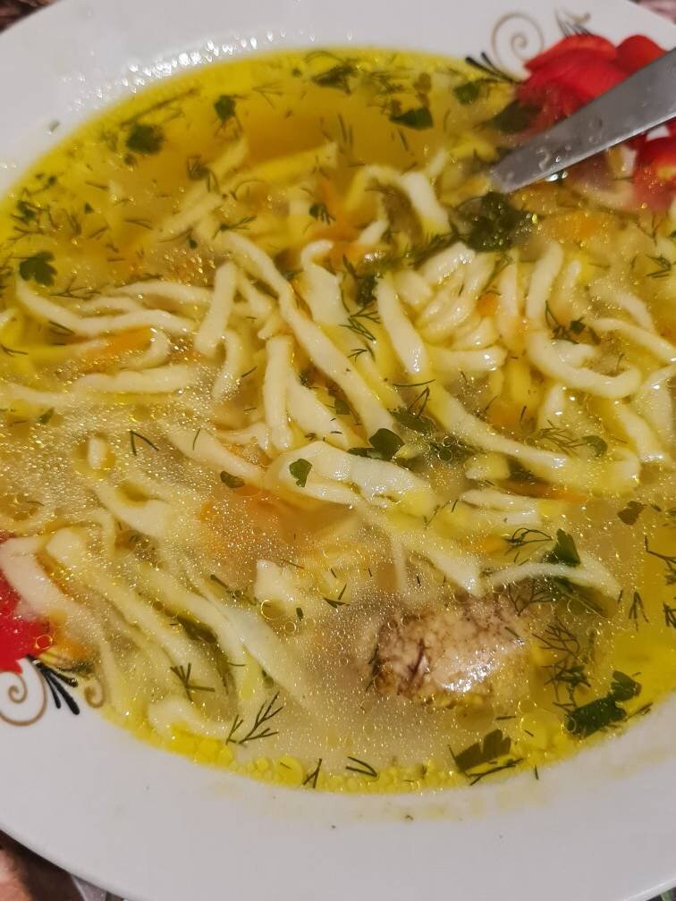 Кто ещё не знаком с молдавской кухней, кислый квас очень важный ингредиент для приготовления первых блюд, в том числе и замы. Если все-таки искали и не смогли найти, можно заменить порошком или лимонной кислотой. Только не ищите квас, а кислый квас,"borş" (борш) или "borş acru" (борш акру) Ингредиенты: Курица домашняя (можно и бройлер), воды, большая луковица, морковка, Помидор, Болгарский перец (не обязательно), Укроп и петрушка, Соль, Квас, Лапша:, мука, соль, яйцо Способ приготовления: Мясо курицы обработать, помыть, разделить на куски, снова промыть. Вскипятить воду в большой кастрюле, у меня 5 л, положить мясо (рассчитывайте так чтобы вода покрыла полностью мясо, в пропорции 1:3) и убавить огонь. У меня спинка и голень. Варить мясо при слабом огне, время от времени снимая пену, чтобы зама получилась прозрачной. Как только пены становится меньше, можно добавить лук (я добавляю целую луковицу), морковку (кружочками или тёртую), помидор и перец (мелко порезанный). В это время можно п