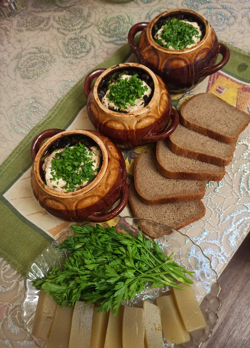 В русской кухне существует множество рецептов приготовления блюд в глиняных горшочках. Традиционным считается жаркое из мяса и картофеля , которое готовят в печи или духовке. В горшочках все ингредиенты достигают готовности одновременно, поэтому блюдо обладает неповторимым вкусом и ароматом. Считается , что готовить продукты в глиняных горшочках придумали на Руси: хозяйки использовали традиционную русскую печь для приготовления кушаний. Я очень люблю готовить в горшочках особенно на праздники ☝️🤗💛 И хочу написать вам самый лучший мой рецепт этого блюда. Ингредиенты: Картофель - 500 г Репчатый лук - 2 головки Чеснок - 2 зубчика Растительное масло для жарки - 3 ст.л Соль Мясо свинина - 1 кг Шампиньоны королевские - 350 г Сметана ЭкоНива - 300 г Лавровый листочек Вода - 1 л Чёрный перец горошком Специальный маринад для мяса Приготовление: Промойте свинину , нарежьте мясо небольшими кубиками и замаринуйте в специальном маринаде ALL-ROUND на час в холодильник. Теперь через час устано