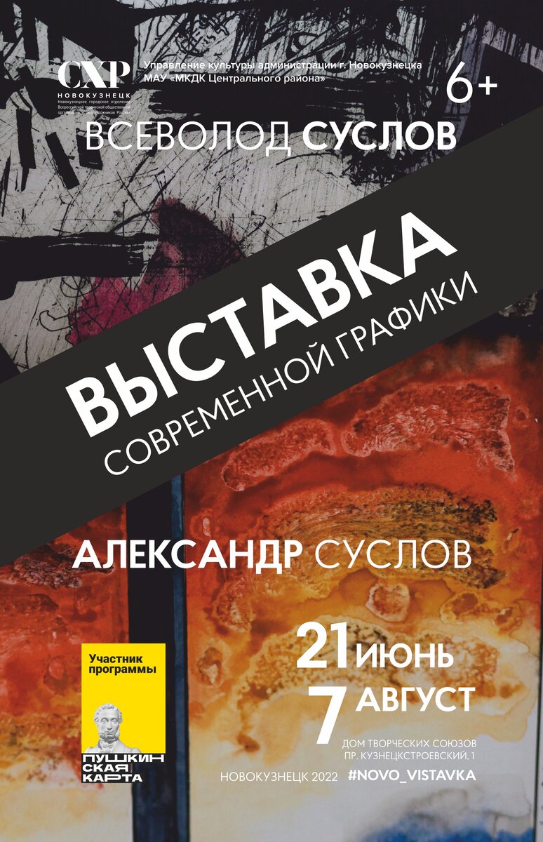 21 июня в 18.00 в Доме творческих Союзов состоится открытие художественной выставки «Параллели». На ней представлена коллекция графики известных новокузнецких авторов, отца и сына Александра и Всеволода Сусловых. В экспозицию войдет более 50 произведений художников – уникальная и печатная графика. Александр Суслов (1947 г.р.) – председатель Новокузнецкого городского отделения Всероссийской творческой общественной организации «Союз художников России», работающий в жанрах монументальной (Музыкальный театр Кузбасса, Кемеровская областная научная библиотека, ДК Шахтеров) и станковой живописи, уникальной графики и декоративного искусства. На его счету огромное количество крупных выставок, симпозиумов, художественных проектов в Сибири и Германии. Кроме того, Александр Суслов пишет стихи и авторские песни. В издательствах Кузбасса вышло 4 книги автора. Являясь культурным и общественным деятелем, Александр Суслов руководил и организовал такие значимые проекты как: Межрегиональная художественн
