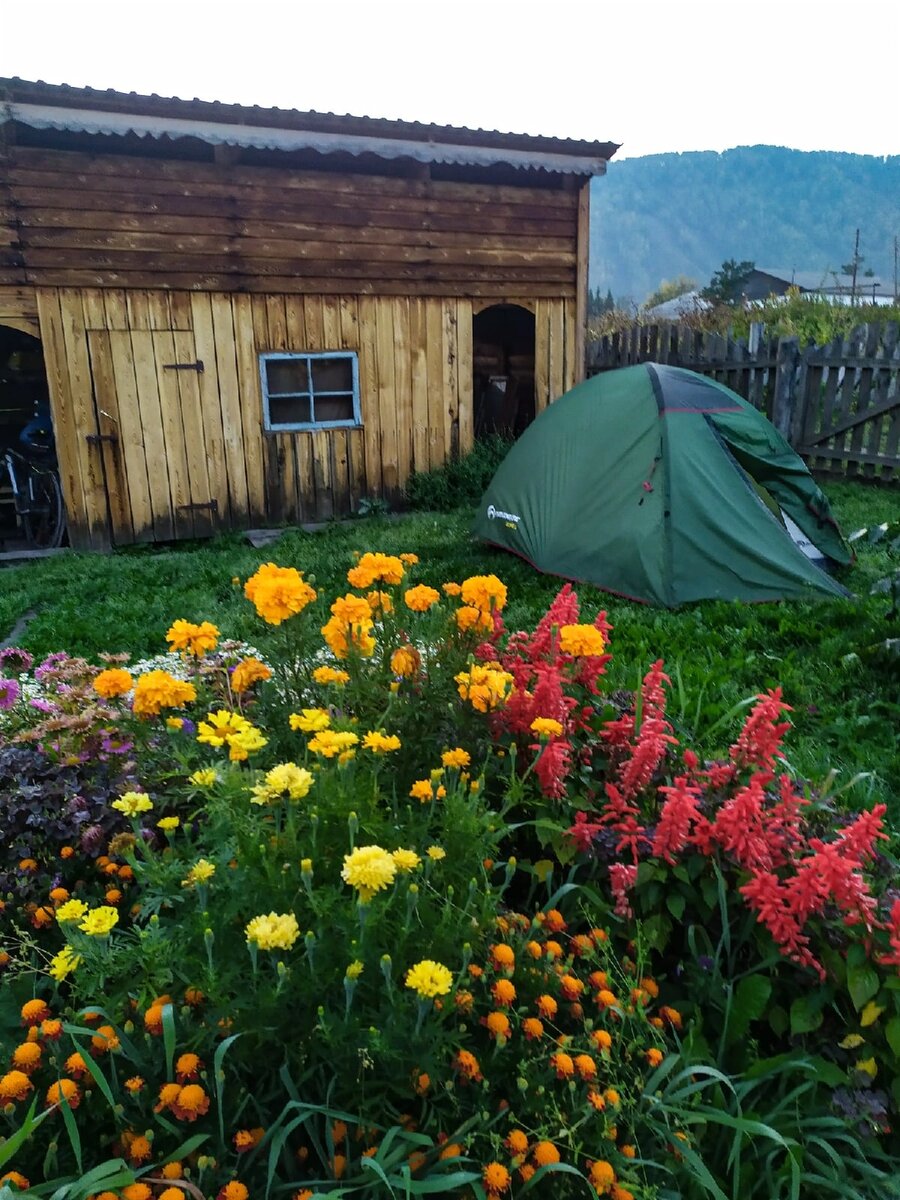 Вчера в сумерках в селе Черга на заборе я увидел табличку: "ночлег, домик, баня". Позвонил по указанному номеру, но мужчина сказал, что гостевой занят, но он сейчас подойдёт. Все мои нужды в этом путешествии свелись к розетке, когда солнечная панель не справляется, нужно дозаряжаться от сети. Хозяин гостевого домика - Александр Владимирович предложил поставить палатку прямо среди цветочных клумб: - Розетка в наличии имеется, ставь, заряжай всё, что нужно. По деньгам оставишь, сколько посчитаешь нужным. Если ничего, я тоже не обеднею. Так я и расположился прямо в палисаднике. Сегодня с петухами начал сбор. А ещё вчера Валерий скептически отнёсся к моему желанию доехать до Белокурихи за день, и позже я понял почему. Мне предстоял ещё один затяжной перевал с гравийной дорогой протяжённостью 60км. Я полз в гору. В начале дня такие подвиги даются мне несложно. Ещё есть ягоды в пороховницах... Где подъём, там и спуск. Подъём я преодолел, но спуск оказался мучительным. Приходилось ех
