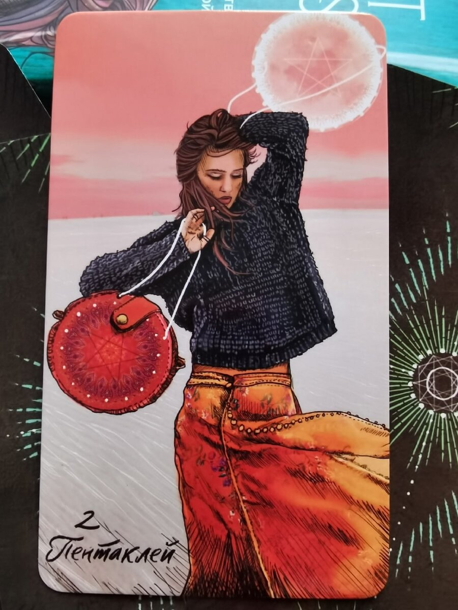 Тайна Двойки Пентаклей – в ее двояком, и при том обоюдно уравновешивающем внешнем и внутреннем действии. Внешне она несет превратности, а внутренне - умение с ними разбираться! Это попытка контролировать несколько дел, ситуаций, проектов, отношений одновременно. В любви работающее значение карты - лавирование между двумя партнерами. Это как невозможность выбрать и человек пытается удержать два дела, двоих людей. Можно ожидать, что так или иначе проявится и приспособление к партнеру и равновесие полюсов. Предупреждает: за двумя зайцами погонишься, ни одного не поймаешь.