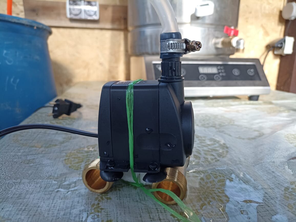 Здравствуйте, друзья! Так как у меня на даче нет центрального водопровода, пришлось что-то придумывать самому. Выбор остановил на охлаждении самогонного аппарата с помощью аквариумной помпы. Были сомнения, насчёт неё, сможет ли она продавить холодильник и вообще поднять воду на такую высоту. Помпа вот такая, купил её в магазине для самогоноварения. Можно было на Али заказать, но ждать времени не было совсем. Шланг закрепил хомутом, на всякий случай. А к насосу примотал утяжелитель, так как присоски плоховато держат. Естественно сначала подсоединил для проверки к неподключенному аппарату, чтобы удостоверится, сможет ли. В качестве резервуара для воды выступила пластиковая бочка на 200 литров. Не смотря на то, что подключал и холодильник и дефлегматор последовательно, помпа продавливает, вполне неплохая струйка. Начальная температура воды в бочке 9,3 градуса, наливал с колодца шлангом через насос ручеёк. Поставил самогонный аппарат на нагрев, для разгона на 3500W. Перегоняю зерновую бра