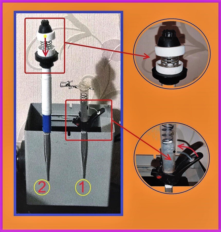 В этой статье, вашему вниманию, предложено описание еще двух изделий захвата с использованием пинцета. В приведенных изделиях дополнительно использованы элементы его самовозврата и фиксации. 1. В первом варианте изделия использован курок со штырем - стержнем от заклепки, фиксирующий зажатое состояние пинцета. Курок взят от флакона распылителя. Нажав на курок, штырь входит в отверстие цилиндра от шприца, попадая внутри в просвет пинцета. Для освобождения пинцета, нужно поднять курок и пинцет вернется в исходное состояние за счет пружины в цилиндре. Курок возвращается в исходное состояние под действием другой пружины, закрепленной с одного конца с помощью гвоздика на цилиндре. Курок можно использовать также для временного удержания пинцета в зажатом состоянии, зафиксировав штырем положение пинцета в цилиндре, не помещая его в просвет. 2. Во втором варианте использована пружина, которая обеспечивает возврат пинцета. Пружина установлена между двумя колпачками от флаконов. При нажатии на шт