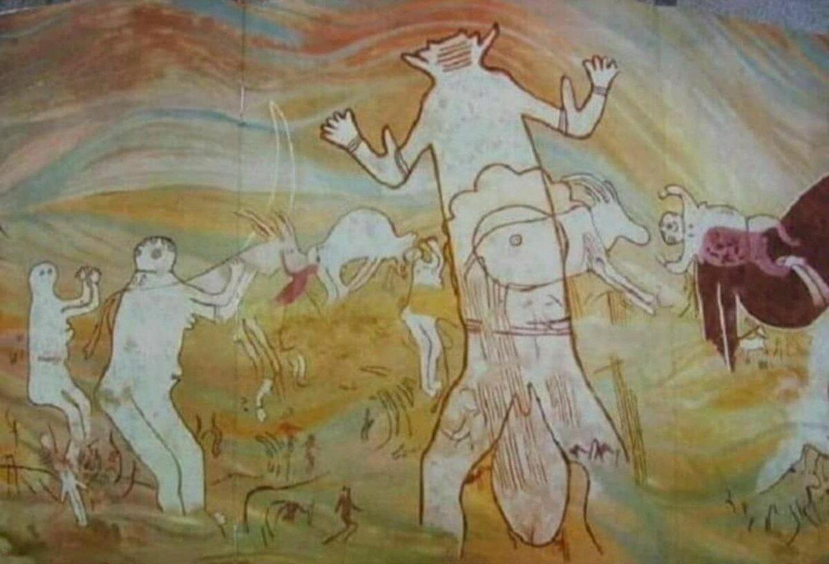 Тассилин- Аджер - национальный парк в пустыне Сахара, расположенный на обширном плато на юго-востоке Алжира. Во многих пещерах и трещинах в осыпающихся скалах находится кладезь древних наскальных рисунков, ссмые молодые из которых- 7 век н.э., самые старые- 7000 лет до н.э. С момента его первого открытия в 1910 году и последующих исследований в 1930-х годах научные группы серьезно исследовали этот район. То, что они обнаружили на стенах пещеры, было поразительным и удивительным; некоторые говорят, что изображения свидетельствуют о том, что Землю посещали инопланетные астронавты. Независимо от того, какую сторону дебатов об инопланетянах принимали исследователи, они согласились, что это место не было похоже ни на что другое. Одно можно сказать наверняка. Как и многие другие картины этого типа по всему миру, эти существа изображены в виде гигантов .