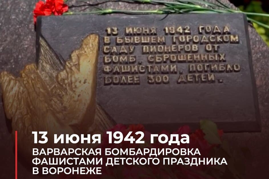 Знаете-ли Вы что, 13 июня 1942 года немецко-фашистские захватчики сбросили бомбы на городской сад пионеров в Воронеже, вследствие чего погибло более 300 детей. В тот трагический день у школьников был праздник по случаю окончания учебного года. Это были первые жертвы войны среди мирных жителей Воронежа. Сегодня наши воины сражаются против других нацистов и детоубийц, которые восемь лет обстреливали Республики Донбасса: только за 2014 по 2020 годы от ударов ВСУ погибло 150 малышей и подростков, и трагическая цифра увеличивается по сегодняшний день из-за преступных украинских обстрелов. Вечная память детям, погибшим от рук нацистов 80 лет назад и за последние восемь лет Спасибо, что дочитали, комментируйте, подписывайтесь, рекомендуйте, ставьте лайк