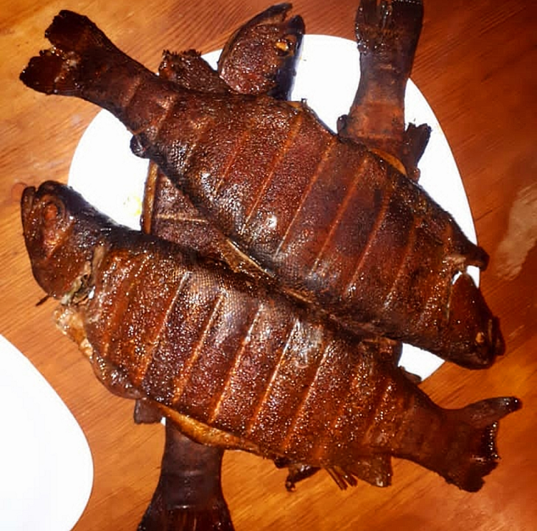 Рецепт традиционно сплошная импровизация...вроде вышло весьма съедобно, посему зафиксирую: 1) Достаём из морозилки зимнюю форельку, свежевыловленную самолично😎🎣 потрошим и удаляем жабры. 2) Маринуем часок в чекушке соевого соуса+сок 2 лайма+корешок имбиря на мелкой тёрке. 3) Готовим коптилку- ольха, груша, яблоня- не принципиально. У меня была груша в наличии. 4) Опосля маринада, сушим на бумажных полотенцах, НЕ промывая. 5) Натираем рыбок смесью сухого укропа и копченой паприки. Внутри и снаружи. 6) Фаршируем мятой и лаймом. И на поверхности тоже. 7) Закладываем в коптилку и на огонь! 8 ) Как пошёл дым- засекаем ПОЛЧАСА! 9) Снимаем с огня, открываем, достаём. 10) Наслаждаемся АРОМАТОМ! 11) Стараемся не захлебнуться слюной, вкушаем и не забываем про кости! #особенности национальной рыбалки #рыбалка #рыбалка в россии #подмосковье #форелька #копченая форель #мужская кухня #папа может #мамкин добытчик #папкин кулинар