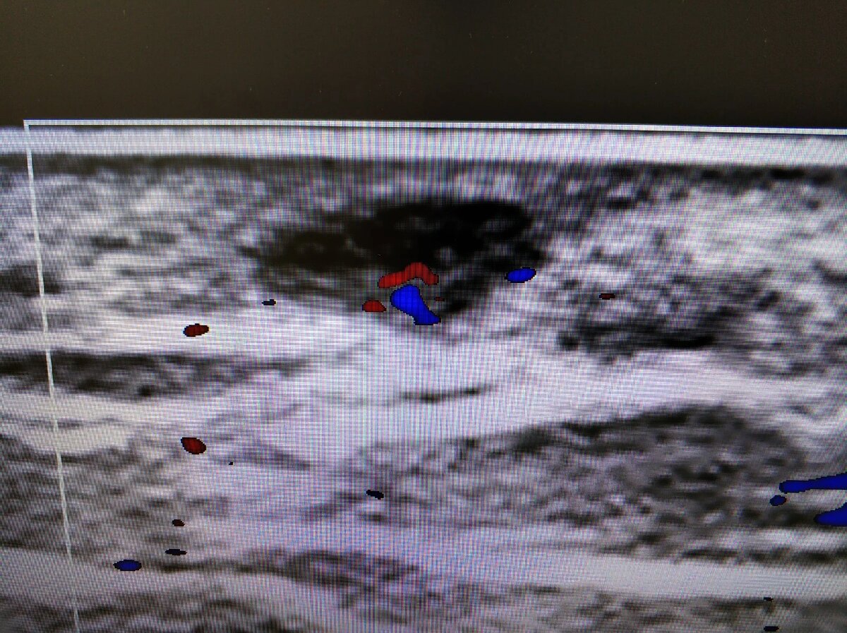 🧐Пальпируемое образование промежности в виде маленького шарика. Пациент направлен для исключения связи с прямой кишкой, а так же разобраться с природой образования. . 🖼️На снимке образование овальной формы, горизонтально ориентировано, преимущественно гипоэхогенное. Расположено в дерме, немного выходит в гиподерму. 👨💻При снижении динамического диапазона виден гиперэхогенный компонент с единичным сосудом. Сосуд входит через одну точку, гиперэхогенный тяж к краю образования - ворота. Структура типичная для лимфоузлов. . . #узи #узд #ультразвук #промежность #лимфоузел #образование #generalimaging #мягкиеткани