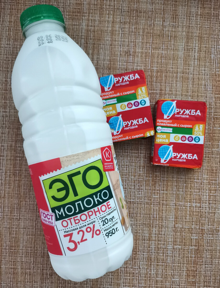 Из покупок сегодня молоко 1 л, хлеб белый, 2 сырка "Моя цена" (люблю именно эти дешёвые, делаю с ними салат из свежих овощей и зелени).