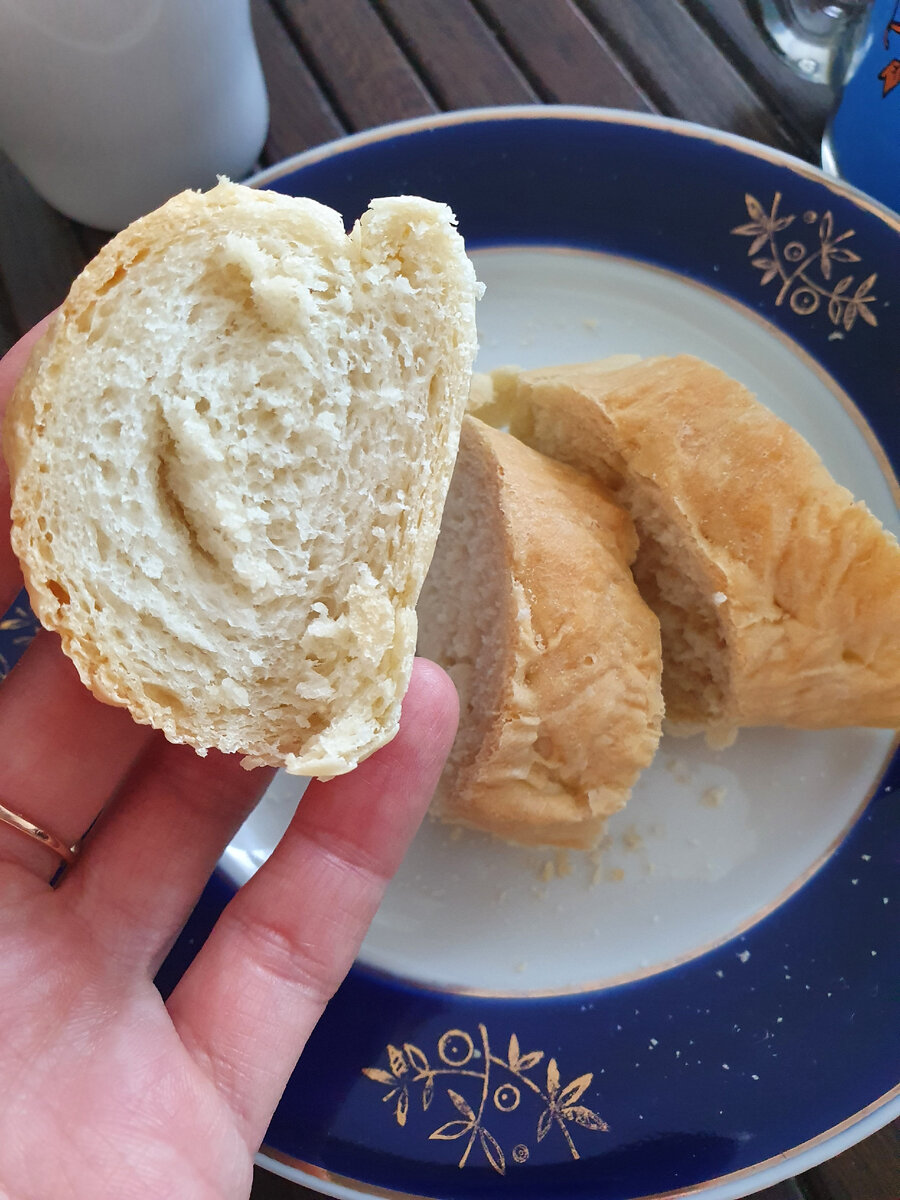 Что может быть уютнее аромата свежеприготовленного хлеба. Запах не только на всю кухню... Соседи тоже глотают слюнки... Предлагаю Вашему вниманию очень простой рецепт. Хрустящая корочка, нежный мякиш внутри....он не оставит никого равнодушным.. Ингредиенты: 700 гр. пшеничной муки 12 гр. сухих дрожжей 1 ст. ложка сахара 2 ч. ложки соли 420 мл теплой воды 40 гр. сливочного масла (можно заменить растительным) Приготовление: В просеянную муку добавляем дрожжи, соль, сахар, перемешиваем. Добавляем воду и замешиваем тесто. Добавляем масло и снова смешиваем. Накрываем миску полотенцем и убираем в теплое место на 1 час. (Я обычно прогреваю духовку до 40-45С и ставлю туда). Смазываем рабочую поверхность растительным маслом, выкладываем тесто и делим его пополам. Каждую часть хорошо разминаем пальцами, складываем конвертом, затем аккуратно растягиваем в прямоугольник и сворачиваем рулетом, формируя в батон. Выкладываем наши батоны на противень, застеленный пергаментом, накрываем полотенцем и