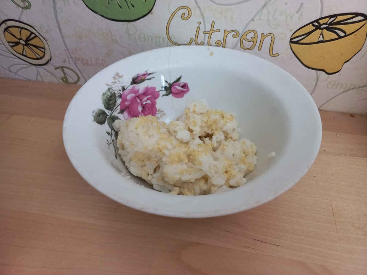 У меня было 1 пакетик каши дружба - смесь пшена и риса (они продаются в пачках по 80 гр. очень удобно когда не знаешь пропорций воды, считай закинуть 1 пакетик и сколько нужно сам в себя впитает)