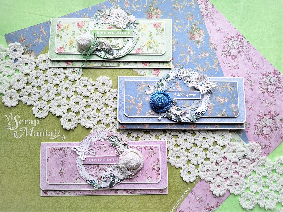 Поэтому применила везде вязанный декор в виде дамской шляпки, бабочек, вырубку, цветы мелкоцвета и высечки из листа с картинками 10х30 «Восхищение». Давайте рассмотрим дет