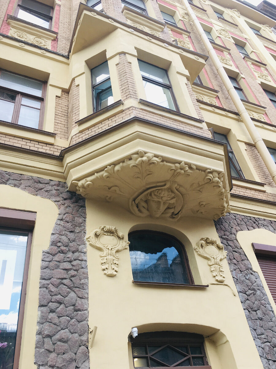 Кстати, на фасаде между третьим и четвертым этажами тоже идёт целый ряд маскаронов, но уже с мужским ликом. В данном случае древнегреческого бога Гермеса в крылатом шлеме. И над центральной парадной, под эркером, тоже изображён лик это бога.