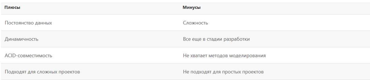 - ACID-совместимость. Обеспечивает строгую согласованность данных.
