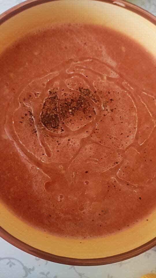 #лайфхаки Этот суп можно приготовить из летних овощей. Самый ленивый суп который только можно придумать , требует минимального количества ингредиентов и усилий. А ещё приятно его кушать когда жарко Ингредиенты: Помидоры, огурец, Четвертинка лука, чеснока, Половина сладкого красного перца, Специи,ускус,масло для заправки Способ приготовления: Моем овощи. На помидорах делаем крестообразный надрез и заливаем кипятком. Чистим лук,чеснок, огурец. С помидоров снимаем кожу(если любите поострее,то можно добавить горького перца) Режем все овощи и забрасываем в блендер. Если есть желание,то можно разбавить суп томатным соком Выливаем в миску наш суп,солим,перчим,заправляем маслом и уксусом или лимоном по вкусу. Ставим суп в холодильник на 2-4 часа(чем дольше тем лучше) Перед подачей можно добавить сухари,сыр Фета и зелень. Суп получается холодный и лёгкий, отлично кушать в жару Приятного аппетита ♥️