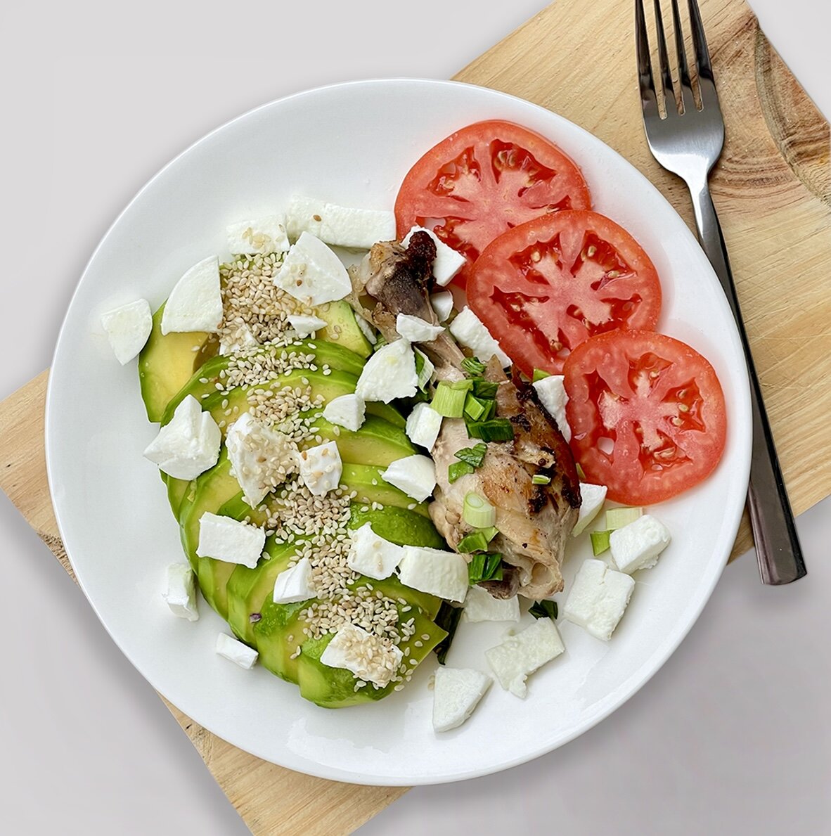 🥑КЕТО ОБЕД НА 786 ккал Я совмещаю интервальное голодание и КЕТО. Именно так можно добиться быстрых результатов в потере веса. О пользе одного и другого ещё будем говорить и очень много. А пока рецепт вчерашнего обеда, обед у нас в 12:00, очень быстрый в исполнении, вкусный и насыщенный клетчаткой. Без углеводов и сахара. 🍗ИНГРЕДИЕНТЫ🍗 - 100 г спелый авокадо - 30 г помидоры - 30 г моцарелла - 1 ч.л. Оливкового масла - 1 куриная ножка - 1 ч.л. Кокосового масла - щепотка кунжута 🍴ПРИГОТОВЛЕНИЕ🍴 1. Разогреваем сковороду, добавляем кокосовое масло, курицу солим и перчим, обжариваем до золотистой корочки с двух сторон, затем уменьшаем огонь и тушим до готовности в собственном соку, если курочка не выделила достаточно жира, можно налить немного воды. 2. Режем авокадо, помидоры, сыр, кладём на тарелку, поливаем оливковым маслом, солим и перчим по вкусу, сыпем кунжут сверху. У Андрея ещё был гарнир в виде тушеной капусты (у мужчин норма калорий выше) и курочки было побольше,