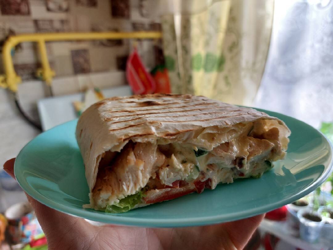 Сама шаурма готовится быстро, но час дается на то чтобы мясо по мариновалось немного... Ингредиенты: куриные грудки филе, большой огурец, больших помидора, листья салата, больших лаваша, Для соуса:, сметаны, майонеза, горчицы, чеснока, карри, Для маринада:, майонеза, перца, соль, итальянские травы Способ приготовления: Мясо грудку куриную режем маленькими брусочками, добавляем приправы, солим, перчим, заправляем майонезом и оставляем мариноваться на минут сорок. Огурчик и помидоры режем мелкими кубиками, и попутно готовим соус смешав хорошенько все составляющие. Мясо обжариваем на среднем огне постоянно перемешивая до готовности от 10-20 минут. На лаваш выкладываем листья салата, затем обильно соусом. Далее помидоры, огурцы и мясо. Плотно сворачиваем в конверт, и обжариваем на сковородке гриль по минуте с каждой стороны. Для удобства разрезать на пополам. Приятного аппетита!!!