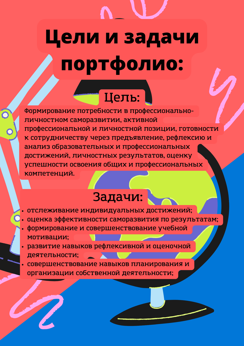 Портфолио (от англ. portfolio - портфель, папка для важных дел или документов) - это набор документов, образцов работ, фотографий, дающих представление о предлагаемых возможностях. Ведь благодаря портфолио, даже не видя вас, и не общаясь с вами, у человека есть возможность сделать конкретные выводы о вас. ЦЕЛЬ И ЗАДАЧИ ПОРТФОЛИО Введение портфолио может повысить образовательную активность студентов, уровень осознания ими своих целей и возможностей. Цель: отслеживание и оценивание сформированности общих и профессиональных компетенций, динамики индивидуального развития и личностного роста, поддержка образовательной и профессиональной активности студента и самостоятельности в процессе изучение профессионального модуля. Портфолио позволяет решать следующие задачи: 1. Повышать учебную, профессиональную мотивацию, активность и самостоятельность студентов; 2. Расширять возможности для самореализации обучающихся; 3. Отслеживать индивидуальные достижения студентов; динамику развития профессиона