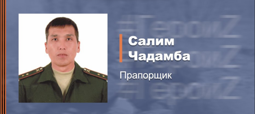 Прапорщик Салим Чадамба, фельдшер С первого дня проведения специальной военной операции по защите Луганской и Донецкой народных республик прапорщик Салим Чадамба самоотверженно оказывал помощь раненым бойцам и командирам. Действуя в составе батальонно-тактической группы российских мотострелков, Салим участвовал в освобождении одного из населенных пунктов от подразделений украинских националистов. Оставляя позиции, радикалы вели ответный огонь по российским войскам, используя при этом минометы. В ходе боя Салим, несмотря на непрекращающиеся обстрелы, оказал неотложную медицинскую помощь девяти раненым российским военнослужащим, после чего вынес их на себе из-под шквального огня в безопасное место и организовал маскировку. После боя Салим, погрузив раненых на автомобиль, оперативно доставил их в полевой медицинский госпиталь, где тем была оказана квалифицированная медицинская помощь. Мужественные и самоотверженные действия прапорщика Чадамба позволили спасти жизни раненым военнослужащим.