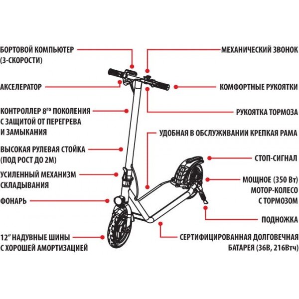 Чтобы не тратить энергию зря и эффективно тормозить, производители стали выпускать модели с комбинированным тормозом — электронный плюс ручной. Бортовой компьютер. У простых моделей есть только светодиодная индикация заряда батарей. Компьютер же показывает текущую скорость, пройденный километраж, остаточный запас хода. Полезная штука.