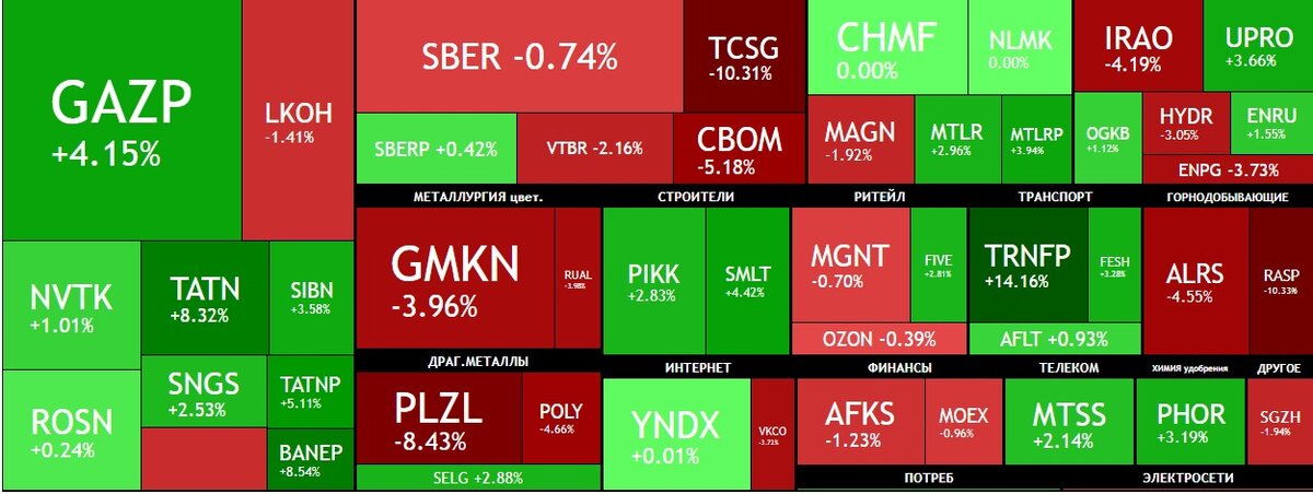Всем привет! Максимальный рост стоимости акций или максимальное снижение некоторых эмитентов российской биржи - что же удивило не только меня, но и остальных инвесторов? В этой статье посмотрим на динамику стоимости фондового рынка, а также посмотрим на более перспективные акции российских компаний. Также я расскажу о своих ближайших планах на покупку. Итак, начнём... Данные рассуждения - это мой личный взгляд на рынок, которым я с вами делюсь... События недели на российском фондовом рынке На прошлой неделе ряд отраслей показали существенный рост стоимости, но и не обошлось без компаний, которые отметились существенной просадкой, давайте посмотрим на эти компании и выберем из них экономически - интересные варианты для возможной покупки. Карта рынка Так выглядит карта рынка за прошедшую неделю. Для тех, кто на канале впервые, объясняю: если цвет красный - акции потеряли в стоимости, если цвет зеленый - акции набрали в стоимости. Чем краснее цвет - тем больше сумма просадки, чем зеленее
