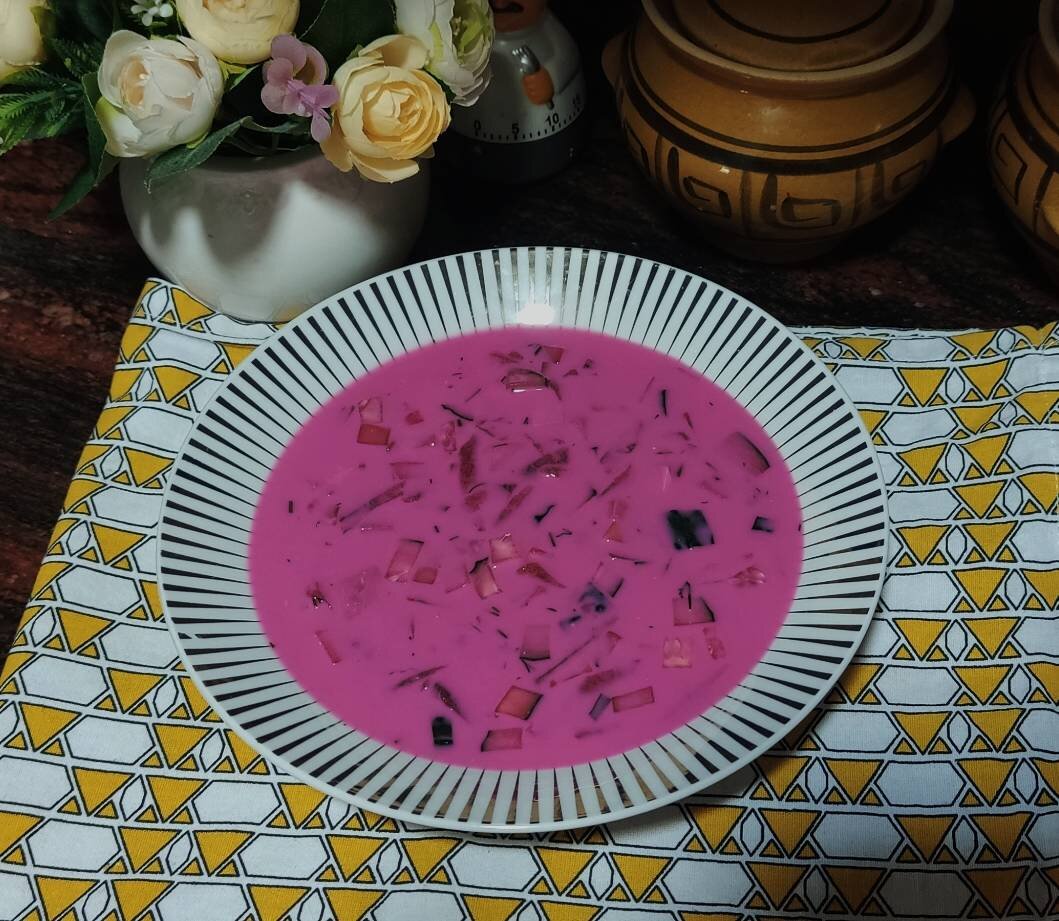 Ингредиенты: Свежий огурец-1-2шт, Яйца варёные-3шт, грудка отварная,или колбаска куриная-1шт, кефир(берите более жидкий)вода кипяченая охлажденная, Зеленый лук,петрушка,укроп, соль,уксус или лимонная кислота, свёкла-1-2шт маленькие, Количество овощей и продуктов регулируйте сами Способ приготовления: Варим или запекаем свёклу,варим яйца и грудку или берем кусочек колбаски куриной.Всё режем небольшими кубиками.Так же режем зелень,огурчики тоже кубиками.Свёклу трем на крупной терке.Все складываем в кастрюлю,и заливаем кефиром.Густоту сами регулируйте.Если кефин жидкий,вода может и не понадобиться,если густой,разведите немного водой.Посолите,добавьте уксус или лимонную кислоту по вкусу,поставьте в холодильник для хорошего охлаждения и приятного аппетита.