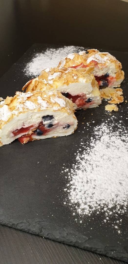 Рецепт воздушного, освежающего десерта #летнееменю #меренговыйрулет #свежо #кремсыр #ваниль #ягоды #вкусно #нежно #выпечка #десерт #готовка #еда Ингредиенты: Белки яичные , Сахар , Лимонная кислота , Кукурузный крахмал , Миндальная стружка , Замороженная клубника , Вода , Голубика , Творожный сыр , Сливки , Сахар с натуральной ванилью Способ приготовления: Взбить белки с добавлением лимонной кислоты. Добавить 100 г сахара и снова взбить до устойчивых пиков. Добавить 15 грамм крахмала и на маленькой скорости вмешать его в белки. Выложить белки на противень, устланный силиконовым ковриком. Присыпать миндальной стружкой и сахарной пудрой. Выпекать при температуре 140 градусов 40 минут. Замороженную клубнику растопить в сотейнике, добавить 20 г сахара и крахмал, разведенный в воде, и довести до кипения. Смешать крем сыр, сливки и сахар с натуральной ванилью до однородной консистенции. Готовую меренгу перевернуть, на нее выложить слой крем сыра, затем клубничное кули, затем голубику и сверн