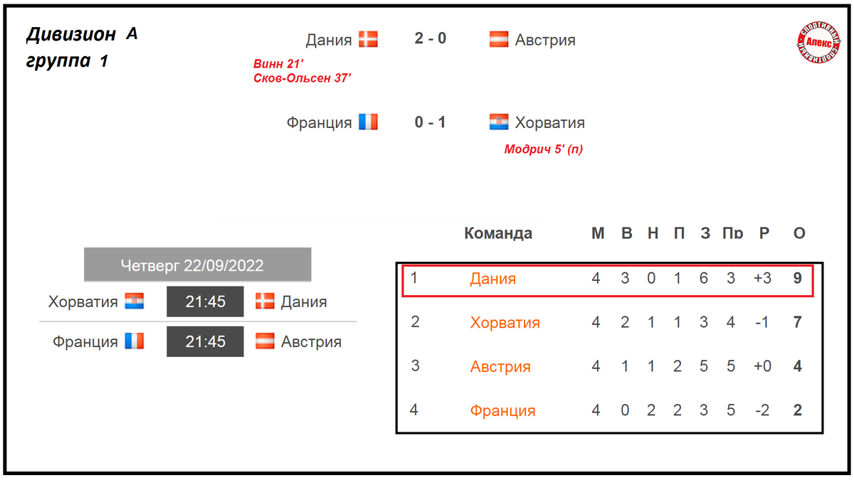 Всем привет. Как завершился 13-й день в Лиге Наций? Смотрим все результаты, изменения в таблицах и в списке бомбардиров. Дания – Австрия 2:0. Франция впервые в истории проиграла Хорватии 0:1. Таблица. Дания удерживает первое место. 9 очков. Хорватия – вторая. 7 очков. Австрия – третья. Франция не побеждает 4 игры (2 ничьи и 2 поражения). Команда явно хочет в дивизион В. Сборная не смогла отстоять титул лучшей команды Кубка Наций. В группа В2 Исландия расписала ничью с Израилем 2:2. Таблица. Израиль имеет 5 очков. Исландия также ещё не проигрывала. 3 очка. у Албании – одно очко. Каждая сборная в этой группе проведёт по 4 игры. Казахстан в группе С3 второй раз обыграл Словакию (2:1). Азербайджан был сильней Белоруссии 2:0, которая не выигрывает 4 матча. Таблица. Казахстан набрал 10 очков. 0 поражений. Остальные сборные уступили по 2 раза. У Словакии – 6 очков. У Азербайджана – 4, Беларусь с двумя очками не сможет претендовать на повышение. Расписание 14 дня. Смотрим лучших бомбарди