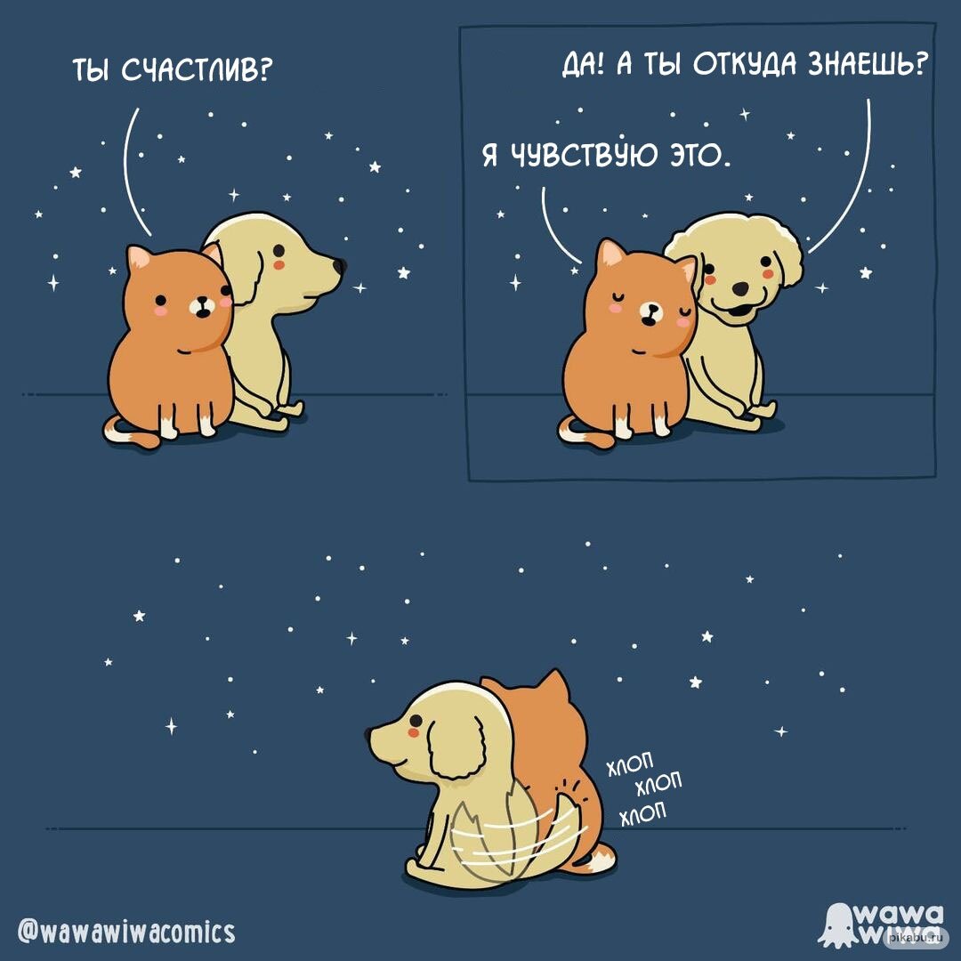 Привет, дорогой друг! Не так давно я собирал в подборку забавные #комиксы от разных авторов, которые были посвящены кошкам, было бы несправедливо обделить вниманием других любимых домашних животных. Так что сегодня я подготовил комиксы, которые так или иначе связаны с собаками. Для собак, как и для других животных, хвост является очень важной частью тела. А нам людям он позволяет определять настроение любимого питомца. Если собачий хвост с неистовой скоростью раскачивается из стороны в сторону, все окружающие понимают, что животное довольно жизнью. Автор wawawiwa comics посвятил этой собачьей особенности отдельный (и очень милый) комикс. Самым существенным отличием собак от кошек для их хозяев является необходимость несколько раз в день выходить на улицу на прогулку. Когда за окном прекрасная погода, выгул приносит удовольствие, но гулять требуется всегда, а не только при идеальных условиях. Автор Alzward’s Corner отлично передает отчаяние хозяев в худшие дни, используя #юмор Если #со