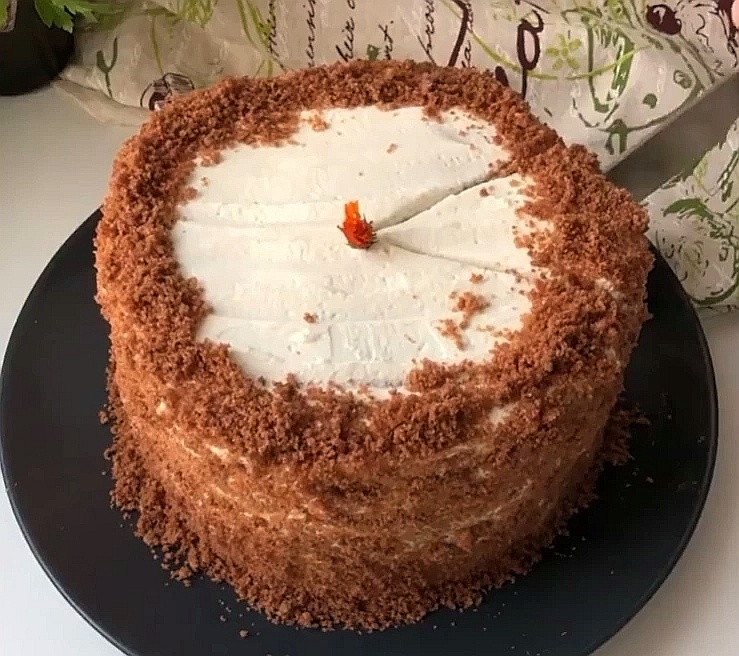 Мир вам, искатели! В этот раз, мы приготовим нечто похожее на наполеон по мягкости и насыщенности вкуса, но из шоколада. Я надеюсь, что подписчикам понравится не только внешний вид торта, но и сам его вкус, в ожидании ваших комментариев! Мука — 280 гр Сахар — 220 гр Сода — 1 ч. л Разрыхлитель упаковка — (10 гр) Какао — 20 гр Яйцо — 2 шт Молоко — 140 мл Масло растительное — 55 мл Кипяток — 100 мл Сметана 20% — 400 гр Сахарная пудра — 80-90 гр Сливочный сыр — 200 гр Ванилин 1. В глубокой миске соединить сухие ингредиенты: муку, какао, разрыхлитель и сахар, венчиком перемешать. Далее, вводим яйца, молоко, растительное масло. 2. Затем, гашенную соду ввести в массу, размешать, в конце кипяток. Быстро перемешайте, чтобы не было комочков. 3. Жарить на хорошо разогретой сковороде, и на медленном огне с 2-х сторон. Не делайте слишком толстые коржи. 4. Для крема просто смешайте все ингредиенты и собирайте торт. 5. Соберите торт и уберите на пару часов в холодильник.