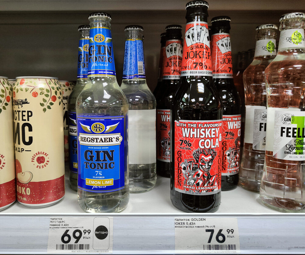 Лично мне ответ давно очевиден. Но я специально купил пару образцов в "Пятерочке", чтобы убить трех зайцев сразу. А именно: Оба напитка купил в той же "Пятерочке", где брал легкие белые вина для предыдущей дегустации. Выглядят они вполне привлекательно: Правда, состав и другие подробности написаны НЕ на контрэтикетке, как у приличных напитков, а вокруг горлышка предельно мелким шрифтом. Поэтому изучить подробно его удалось только дома. Смотрите сами: Лично я ожидал там увидеть спирт с водой и разными ароматизаторами. Но вместо спирта на этикетке внезапно обнаружилось пиво. Хотя его нет ни во вкусе, ни в аромате, ни в цвете. Вкус и аромат предельно химозные, но пиво не ощущалось нигде. Может, оно и к лучшему, но на джин-тоник это всё равно мало похоже. Заявленные на этикетки лимон и лайм так же не ощущались. А из чего же состоит "виски-кола"? Точнее, "золотой джокер с ароматом виски-колы", как написано на этикетке. Читаем: Оказывается, тоже из пива, воды и концентрированного яблочного