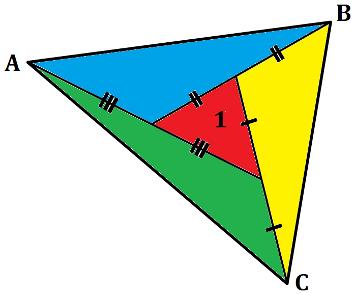 В произвольном треугольнике ABC поместился треугольник с единичной площадью. На чертежё он выделен красным цветом. Предлагаю найти площадь треугольника ABC. Можно, конечно, найти и площади трёх других треугольников, но основная задача - треугольник ABC.