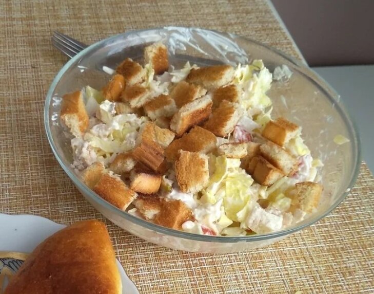 Здравствуйте, уважаемые читатели моего канала. Часто в жизни любой женщины, хозяйки бывают ситуации, когда срочно нужно приготовить что-то вкусное, да ещё и желательно праздничное. Например, гости решили неожиданно забежать на огонёк или, Господи, помилуй, свекровь нагрянула без предупреждения. Про свекровь я, конечно, шучу, мы всегда все очень рады видеть в наших домах любимых мам своих мужей. В общем, в жизни бывает всякое, когда срочно необходимо организовать какое-то подобие праздничного застолья. Сегодня я хочу вам рассказать про мой очень ленивый, быстрый и безумно вкусный способ приготовления любимого многими салата "Цезарь". Конечно, здесь всё готовится совсем не по кулинарным канонам, это одна из вариаций данного блюда, но получается очень вкусно, а главный его секрет в заправке. Обо всем по порядку. Что же нам понадобится для приготовления? Ингредиенты: Отварная куриная грудка - 300 г Салат "Айсберг" (можно использовать и китайскую капусту и обычный зелёный салат, что есть