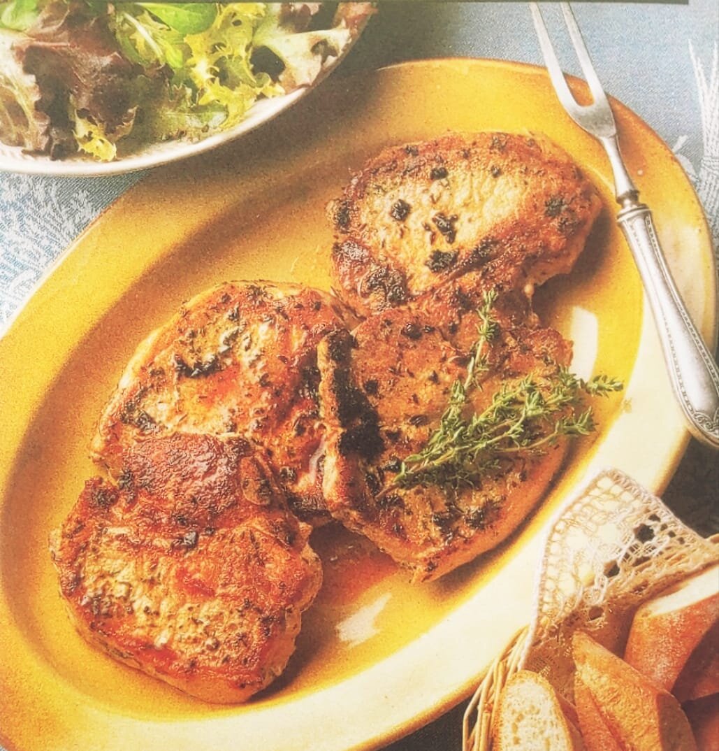 Вам потребуется всего пять минут, чтобы подготовить к жарке эти отбивные. утром или накануне вечером положите мясо мариноваться, а перед обедом вы потратите каких-нибудь 15 мин, чтобы пожарить отбивные. Если вы захотите приготовить это блюдо, вам потребуется купить только сами отбивные - все прочие ингредиенты наверняка найдутся у вас дома. На 4 порции потребуется: 3 столовых ложки растительного масла 2 столовых ложки горчицы "дижон" 5 зубчиков чеснока, мелко нарезанного или выдавленного через чесночницу 3 столовых ложки нарезанной зелени петрушки 2 чайных ложки тимьяна 1/2 чайной ложки молотого черного перца 4 свинные отбивные (толщина 2 см, общ. вес 800 г) 1. Возьмите неглубокий лоток, в который можно уложить отбивные в идин слой. Смешайте в нем растительное масло, горчицу, петрушку, тимьян и перец. 2. Положите в лоток отбивные, переверните, чтобы они покрылись этой смесью с обеих сторон. Накройте лоток и поставьте в холодильник на 6 часов (можно нав всю ночь). Изредка переворачива