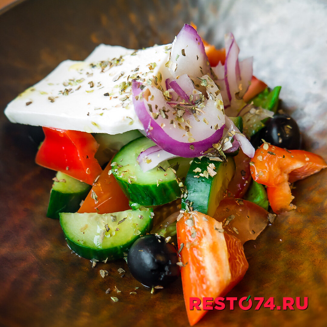 ГРЕЧЕСКИЙ САЛАТ - помидор, огурец, болгарский перец, маслины, сыр Фета и оливковое масло.