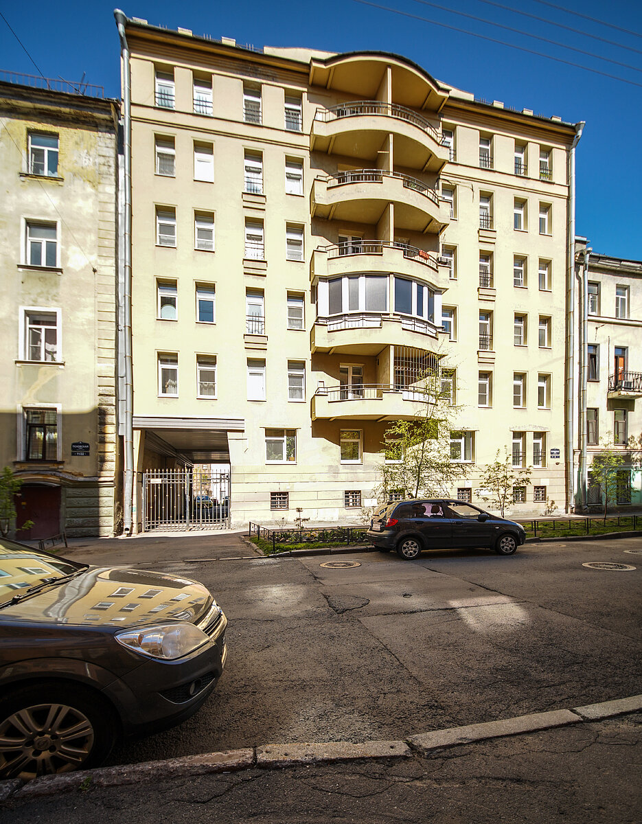 Привет! Давно не рассказывал о каком-нибудь современном здании, построенном в историческом районе. Осматриваемый в этом посте 7-ми этажный дом был построен в 2001 году. На снимке, сделанном до 1999 года, видим что на этом месте был разбит небольшой сквер. В 1902 году здесь стоял двухэтажный дом. Его владельцем представлен Санкт-Петербургский мещанин Яков Яковлевич Воронов. Дышловой извоз это тяжёлый извоз, тяжёлая упряжь, тяговая парная упряжка лошадей. Лошади, перевозившие тяжёлые грузы. В 1912 году новой владелицей Прасковьей Архиповной Балдовской в Санкт-Петербургскую строительную управу было подано ходатайство о надстройке старого 2-х этажного здания тремя дополнительными этажами. На фотографии дома под номером 7 по той же Псковской улице можно увидеть часть старого, снесённого ещё в довоенное время, дома 9. Фрагмент аэрофотосъёмки Ленинграда , сделанной в период с 1939 по 1943 годы. Здание уже снесено. Супруг Прасковьи Архиповны - 31 летний (на 1913 год) купец 2-ой гильдии Паве
