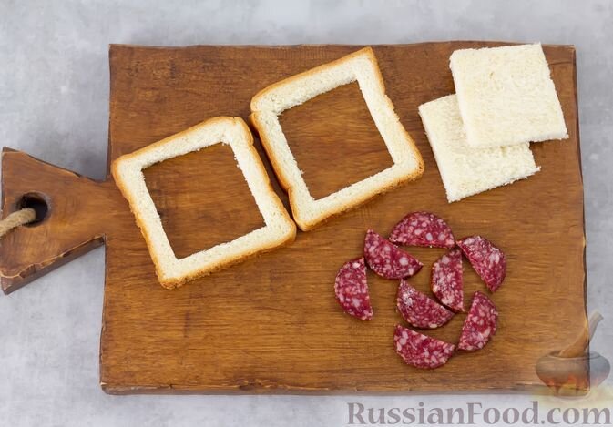 Простые в приготовлении и необычные на вид горячие бутерброды с начинкой из колбасы и яйца - находка для быстрого перекуса или питательного завтрака. Аппетитные бутерброды готовятся быстро, продуктов понадобится минимум, а получается сытно и очень вкусно. Попробуйте! Продукты (на 1 порцию) Хлеб - 2 ломтика (50 г) Колбаса - 4 ломтика (30 г) Яйца - 2 шт. Соль - 2 щепотки Масло растительное (для жарки) - 1 ч. ложка * Для подачи (по желанию): Листья салата - 2-3 шт. Подготовьте ингредиенты. Из указанного количества у меня получилось 2 сытных горячих бутерброда. У меня нарезной тостовый хлеб. Если у вас целый батон хлеба, нарежьте его ломтиками толщиной примерно 1 см. Колбасу очистите от заводской оболочки и нарежьте кружочками толщиной примерно полсантиметра. Из хлебных ломтиков вырежьте мякиш, сохранив примерно 0,7-1 см вдоль корочки так, чтобы получилась "рамочка". Кружочки колбасы разрежьте пополам. Яйца разбейте в миску, добавьте соль и взбейте вилкой или венчиком. Сковороду разог