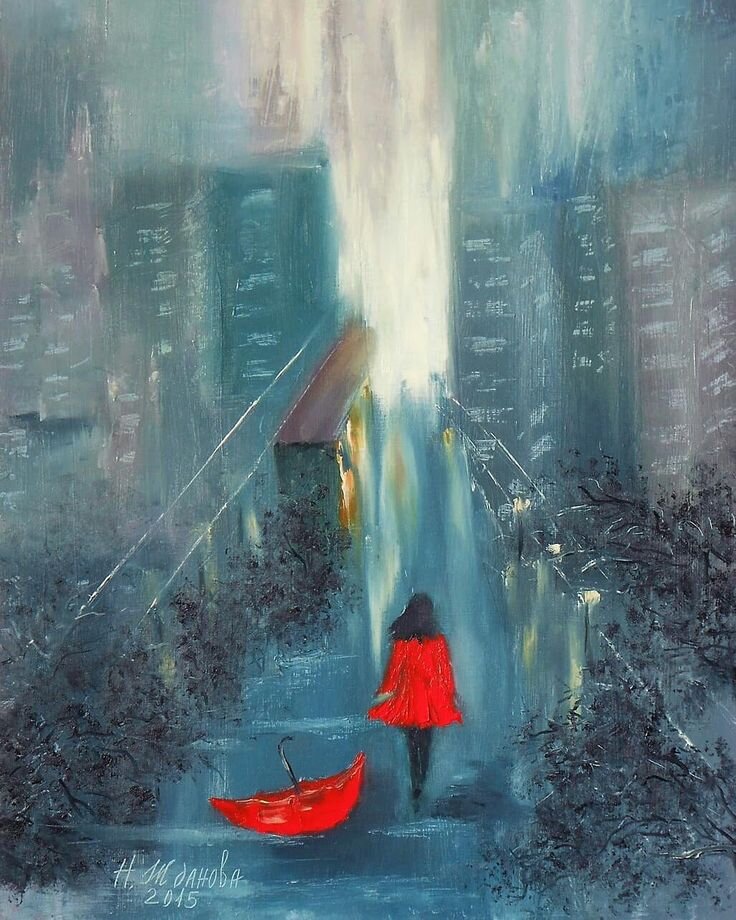 Покров из водных струй нещадно ветер рвал. Потоком нисходить дождь день облюбовал. Он пенясь и бурля, стекал для звона труб, И лился он из глаз, касаясь алых губ. И тут не разобрать - воды лишь бирюза, Где здесь печали туч, где девичья слеза.