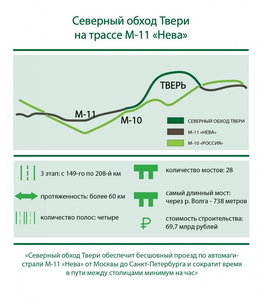 Северный обход Твери - 3 этап магистрали М-11 со 149-го по 208-й км - не вошел в утвержденную программу деятельности Госкомпании «Автодор» на 2010-2021 годы и был вынесен за рамки строительства других этапов в отдельную очередь. В мае 2020 года был выбран подрядчик для корректировки проекта обхода - АО «Союздорпроект», стоимость контракта - порядка 468 млн рублей. Дело в том, что первоначальный вариант обхода был разработан еще в 2009-2012 годах, положительное заключение госэкспертизы было получено в 2014 году. За 6 лет территория в районе Твери динамично развивалась, поэтому и потребовались корректировка и актуализация проектных решений.