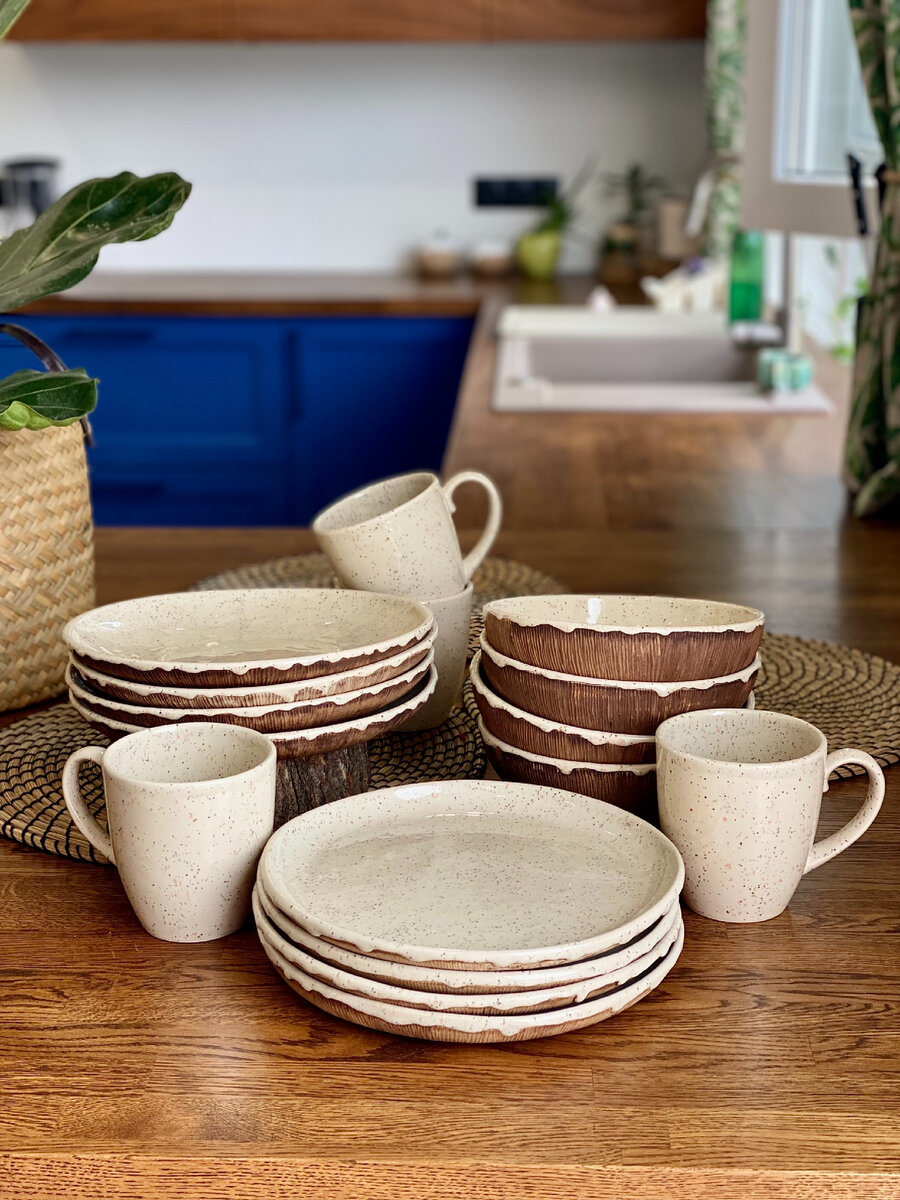 Новый комплект из 4 предметов на 4 персоны. В один комплект входит: 1 глубокая тарелка. 1 плоская тарелка. 1 полуглубокая тарелка 1 кружка. Цена 4 предметов: 5200 р. Мое самое любимо цветовое сочетание и фактура! Комплект Продан. (Под заказ изготовим за 3 недели)