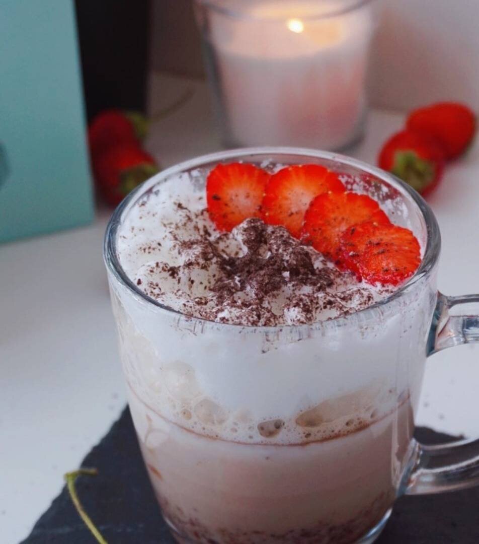 #КлубничныйМокко с шоколадом и клубничным соусом, давайте приготовим этот напиток в домашних условиях.👇🏻 Ингредиенты: 🍓 клубничного соуса (клубника/сахар=4:1);, 🍓 молочного шоколада;, 🍓 кофе;, 🍓 молока Способ приготовления: К растопленному шоколаду добавляем клубничный соус. Для клубничного соуса увариваем клубнику и сахар в соотношении 4 к 1 и пюрируем. Добавляем кофе и перемешиваем. (У меня кофе, приготовленный с помощью дрип-пакета). Подогреваем молоко и взбиваем. Добавляем к шоколадно-кофейной смеси. Я взбивала с помощью ручного капучинатора до крепкой пены, чтоб было похоже на взбитые сливки (только облегчённая версия) Украшаем по желанию, перемешиваем и наслаждаемся шоколадно-кофейным напитком!