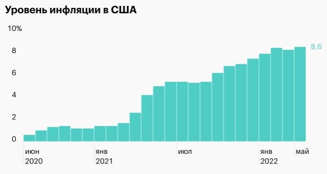 Макростатистика и скорое заседание ФРС разбили надежды инвесторов на скорый отскок на американском рынке. Данные по инфляции 10 июня бюро статистики труда США опубликовало данные по инфляции в мае. Рост потребительских цен снова ускорился: по сравнению с прошлым годом они подскочили на 8,6%. Это выше прогноза в 8,3%. В цене сильно прибавили энергоносители: бензин — 48,7%, мазут — 106,7%, природный газ — 30,2%. Цены на еду подросли на 10,1%. Расходы на жилье — это аренда, услуги ЖКХ и прочее — увеличились на 5,5%. Цены на б/у авто и авиабилеты тоже заметно подросли — на 37,8 и 16,1%. Базовые цены, то есть без учета энергоносителей и еды, выросли на 6%. Это меньше 6,2%, что были в апреле. Но больше ожиданий аналитиков, которые рассчитывали на 5,9%. Такой рост цен привел к падению реальной зарплаты в США. Так, год к году номинальная среднечасовая зарплата выросла на 5,2%, а вот с учетом инфляции — снизилась на 3%. Текущие цены, например рекордные 1,2 $ за литр бензина, негативно влияют на