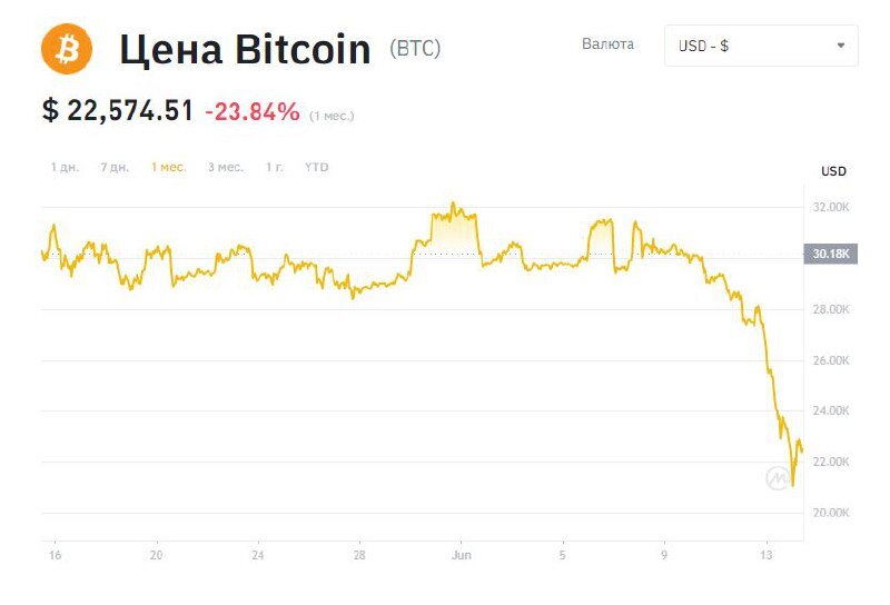 Утром 13 июня курс биткоина резко обвалился. Вслед за ним попадали и другие криптовалюты. Прогноз главного аналитика Совкомбанка, Михаила Васильева от 22 мая этого года для 1prime.ru начинает сбываться, для удобства процитируем основное содержание: "Цена криптовалют, в том числе биткоина, зависит от количества долларов и других "напечатанных" валют, которые обращаются в глобальной финансовой системе. Чем больше в системе денег, тем дороже стоят активы (акции, облигации, недвижимость, криптовалюты). Чем ниже процентные ставки в мире, тем еще более рисковые активы покупают инвесторы, чтобы получать доход. По мере глобального снижения ставок после кризиса 2008 года, а также в пандемию 2020 года наблюдался переход инвесторов из облигационного рынка сначала в акции, а затем и в криптовалюты. В этом году ситуация иная. Глобальная инфляция обновляет рекорды за десятилетия. Причины известны — нарушение цепочек поставок, конфликт на Украине и локдауны в Китае. Кроме того, на рост инфляции оказ